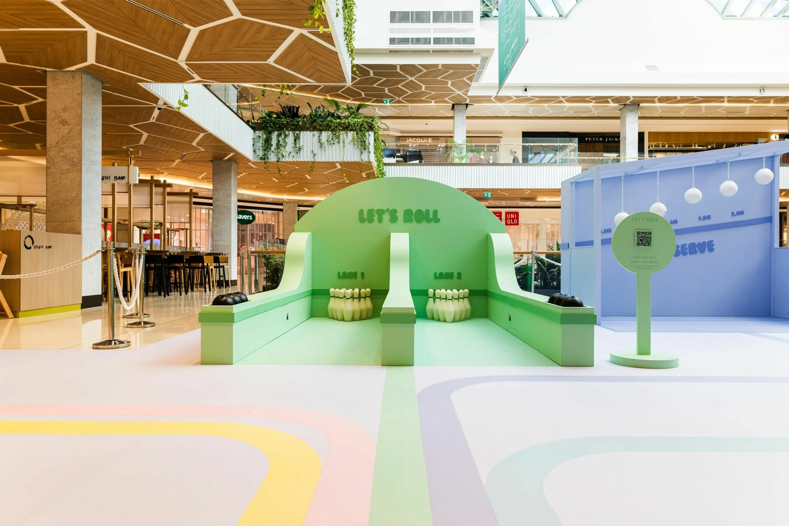 We designed a dynamic sports-themed activation featuring five custom set builds, including skill tester activities for basketball, AFL, bowling, and volleyball, as well as an Instagram worthy diving pool photo moment. Each pod included a custom lollipop sign with a QR code for easy participant registration and competition entry.